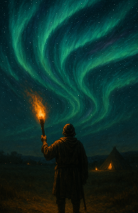 Aurora borealis dan australis: cahaya hijau, merah, atau ungu yang menari di langit kutub dihasilkan oleh partikel matahari yang bertabrakan dengan atmosfer bumi. Bagi masyarakat kuno, ini tampak seperti roh leluhur atau pertempuran dewa.